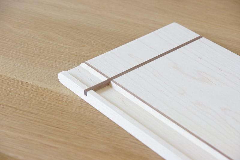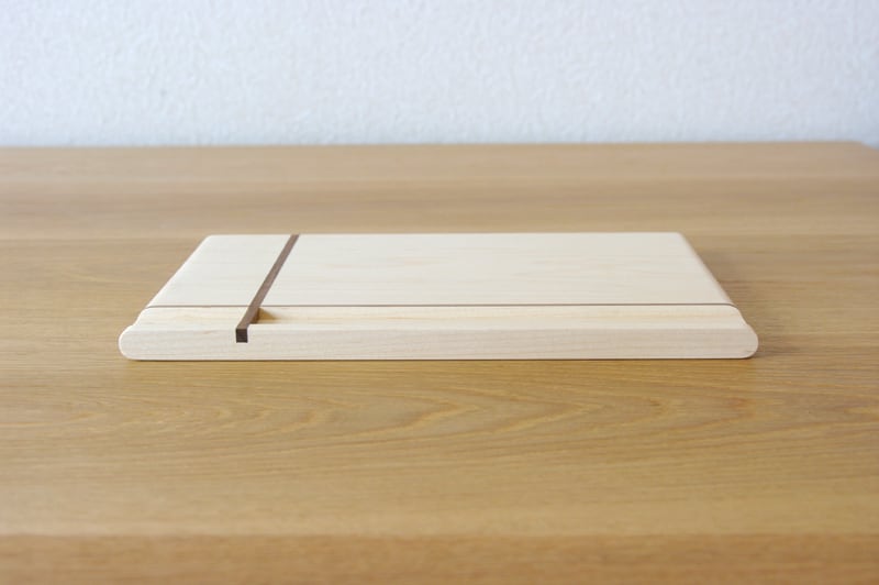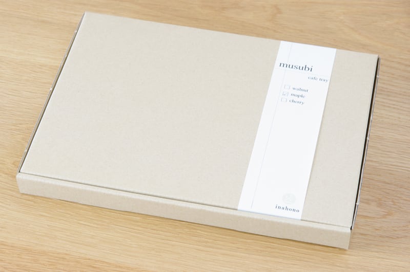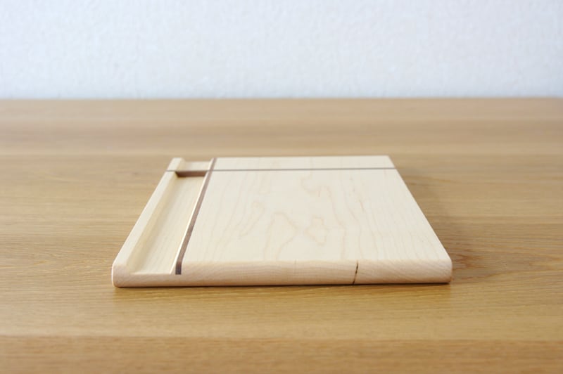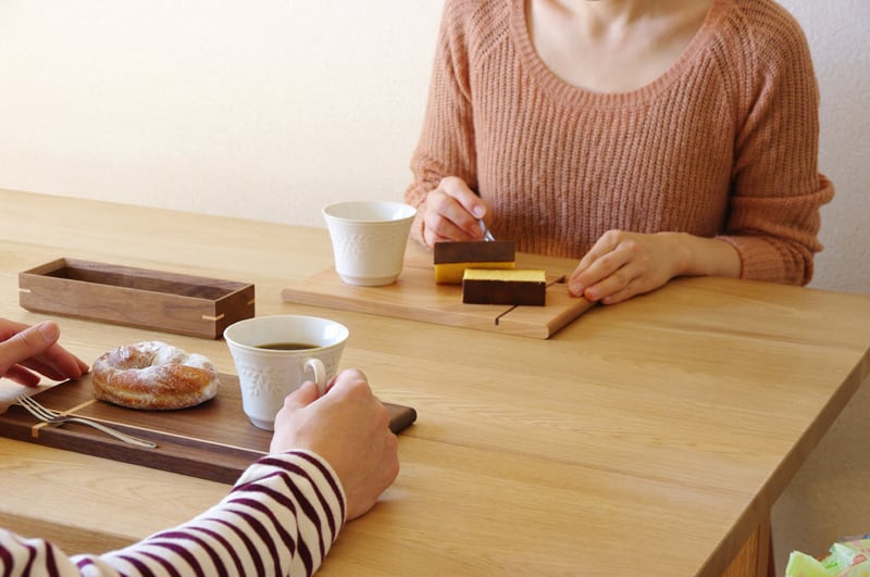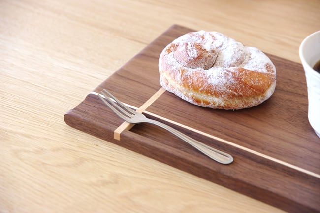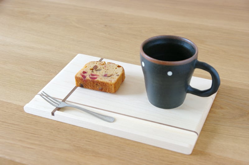 無垢材で作ったカフェトレイです。縦と横に贈り物のリボンのようなラインが入ったデザインが特徴的。そして、縦のラインは箸置きにもなっているのです。ちょっとした遊び心が楽しいカフェトレイです。